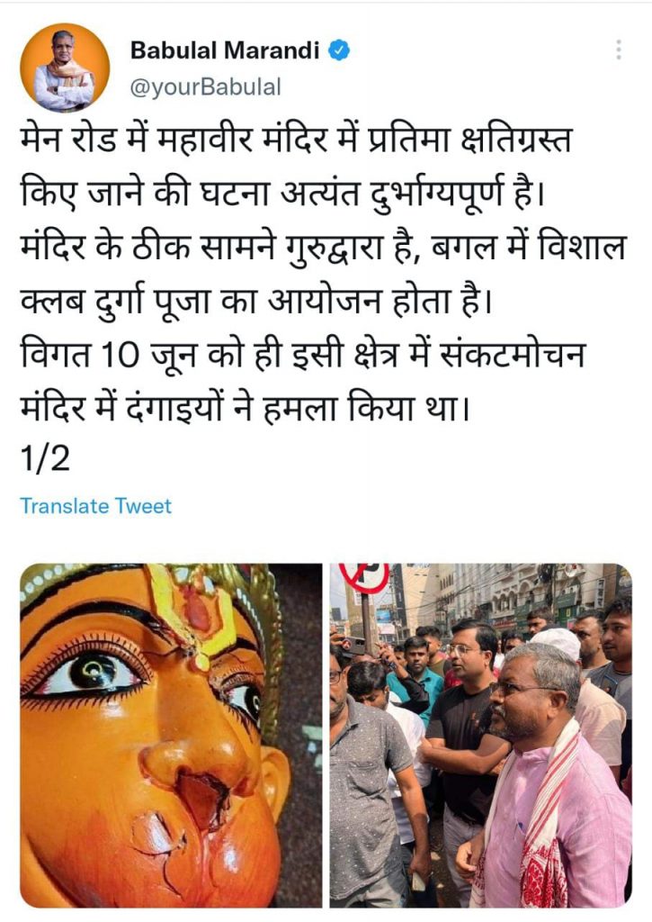 इस मामलें में झारखंड के पहले मुख्यमंत्री बाबूलाल मरांडी ने घटना पर नाराजगी जाहिर करते हुए ट्वीट कर कहा कि मेन रोड में महावीर मंदिर में प्रतिमा क्षतिग्रस्त किए जाने की घटना अत्यंत दुर्भाग्यपूर्ण है।मंदिर के ठीक सामने गुरुद्वारा है, बगल में विशाल क्लब दुर्गा पूजा का आयोजन होता है। विगत 10 जून को ही इसी क्षेत्र में संकटमोचन मंदिर में दंगाइयों ने हमला किया था।