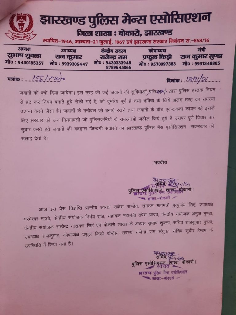 एसोसिएशन के प्रांतीय अध्यक्ष राकेश पांडेय ने बोकारो में प्रेसवार्ता कर सरेंडर नीति पर सवाल खड़े किये। उन्होंने कहा कि वही नक्सली सरेंडर करते हैं जो डेड हैं या फिर नक्सलियो से जिन्हें डर होता है। फिर भी सरकार और विभाग उनका महिमा मंडन करती हैं। उसे सरकारी राशि देकर सम्मानित किया जाता है लेकिन हमारे सिपाही नक्सलियों के खिलाफ ऑपरेशन मे मारे जाते हैं या अपंग हो जाते हैं। उन्हें किसी तरह की सुविधाएं मुहैया नहीं करायी जाती हैं। उन्होंने कहा कि हमारे सिपाहियों को सिर छुपाने की जगह नहीं है। बुनियादी सुविधाएं उन्हें मय्यसर नही हैं. ये खामियां अब बर्दाश्त नहीं की जायेंगी।